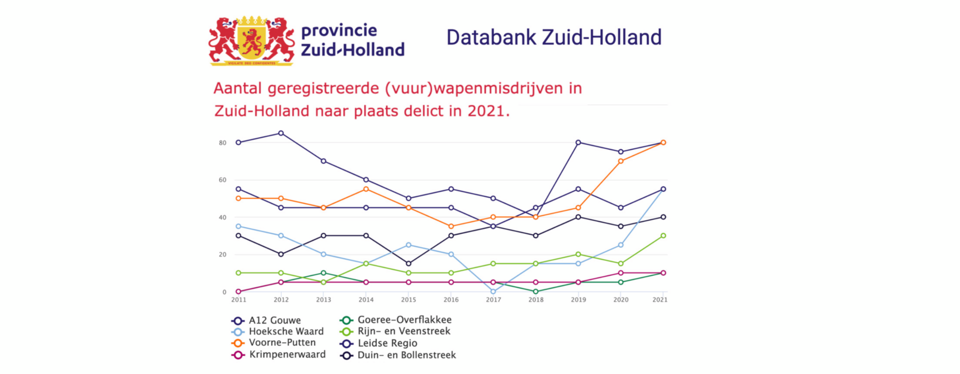 Databank Zuid-Holland is een online tool om verschillende databronnen te raadplegen en data met elkaar vergelijken. Recent zijn onder meer de cijfers over voortijdige schoolverlaters, mbo-gediplomeerden en criminaliteit geüpdatet. Uit deze laatste cijfers blijkt bijvoorbeeld dat ten opzichte van 2020, in 2021 minder misdrijven in Zuid-Holland zijn geregistreerd. Per type misdrijf is een verschillend beeld te zien: zo is bij het aantal geregistreerde diefstallen, verduisteringen en inbraken sprake van een daling, terwijl het aantal geregistreerde (vuur)wapenmisdrijven in vrijwel alle regio’s is toegenomen.