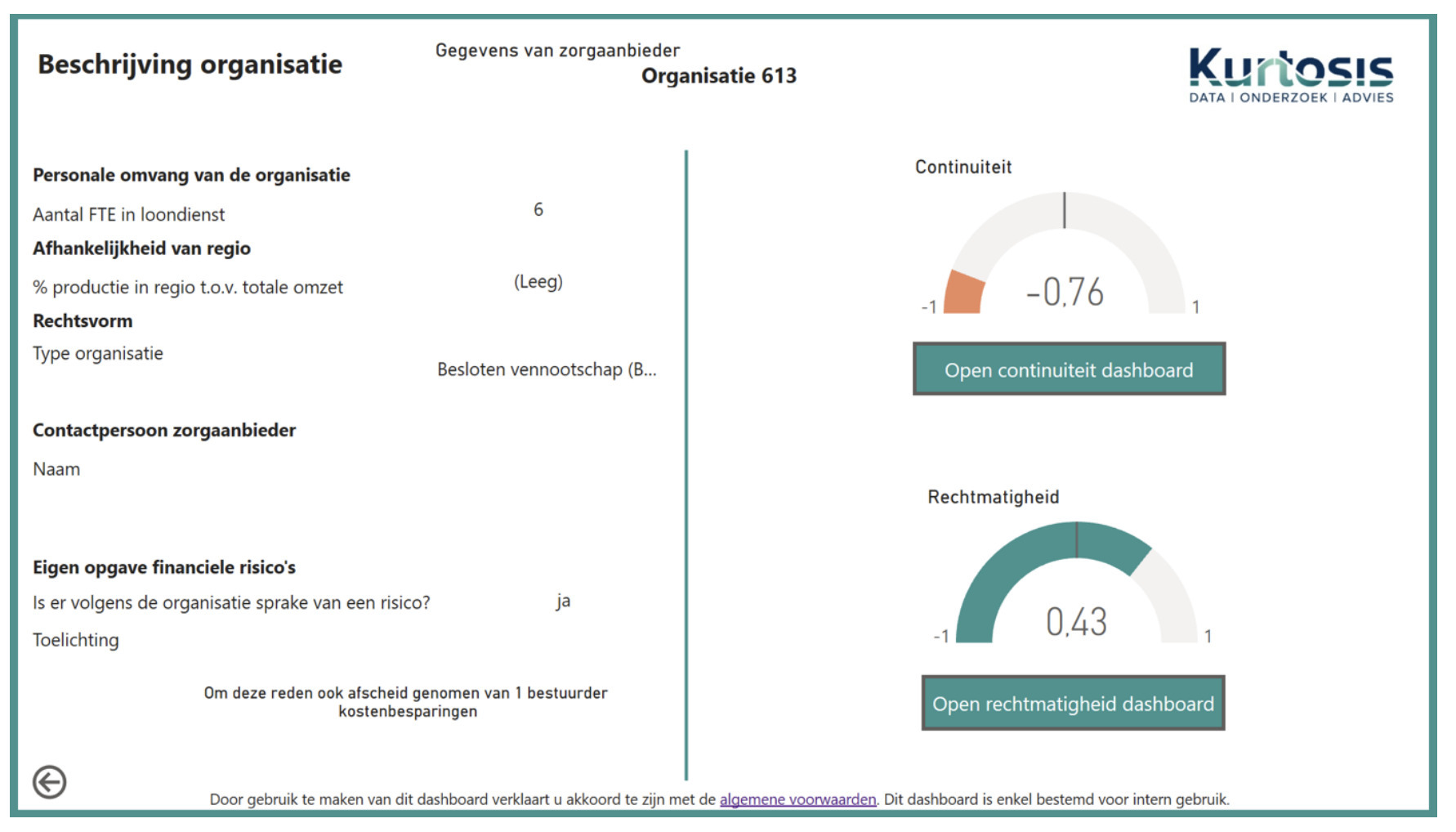 De analyse wordt aangeboden in de vorm van een dashboard. U kunt dit gebruiken bij inkoop, contractmanagement en contractering van nieuwe aanbieders. Doel is vroegtijdige signalering van risico’s op basis van een set indicatoren. Daarnaast maken we gebruik van een modern ‘Machine Learning’ model om de risico’s van volgend jaar in te schatten.